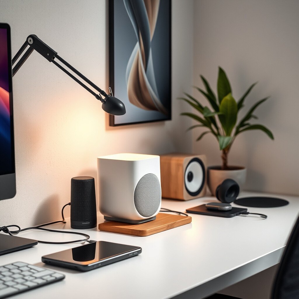 Equip your desk with the latest gadgets, like a smart speaker or wireless charger. Sleek cables and tech accessories complete the look.