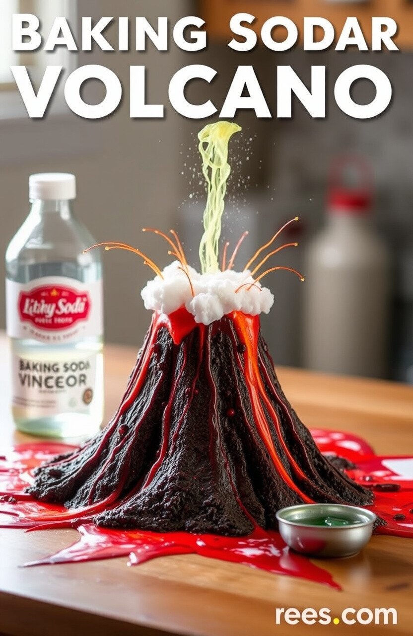 Picture a small volcano erupting right on your kitchen table! A baking soda volcano is a classic, and it’s perfect for sparking excitement. With just baking soda, vinegar, and a bit of food coloring, you can create a foamy eruption.
