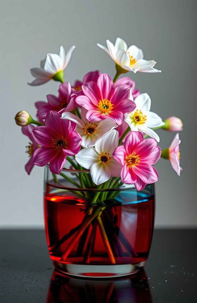 Turn white flowers into a bouquet of colors. By placing them in colored water, watch them transform over time.