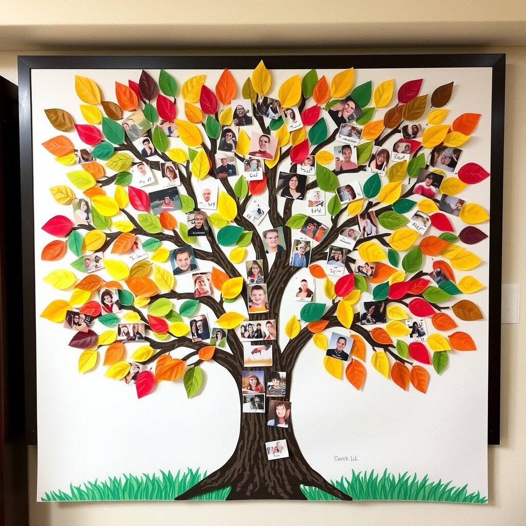 Creating this display is easy with printed photos and a bit of creativity. Use colored paper for leaves or paint them directly onto the board. Add names and dates to bring stories to life.