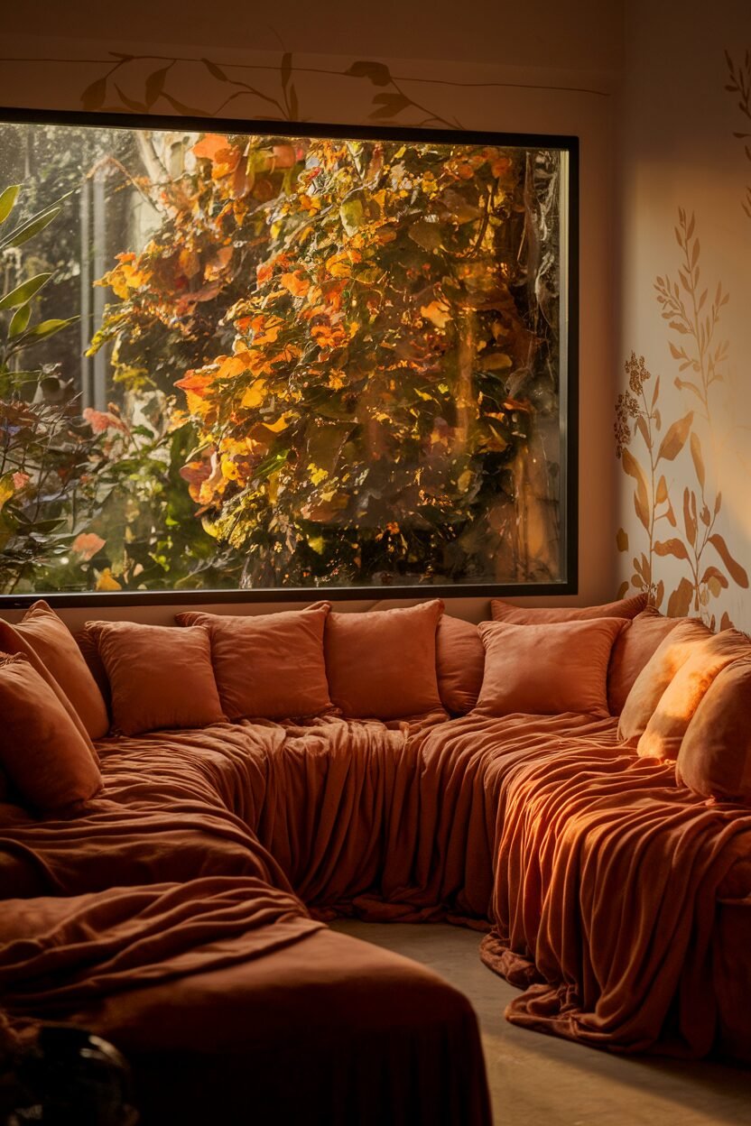 Using nature-inspired textiles can bring the outdoors into your lounge. Think of soft throws, leaf-patterned cushions, and earthy colors!