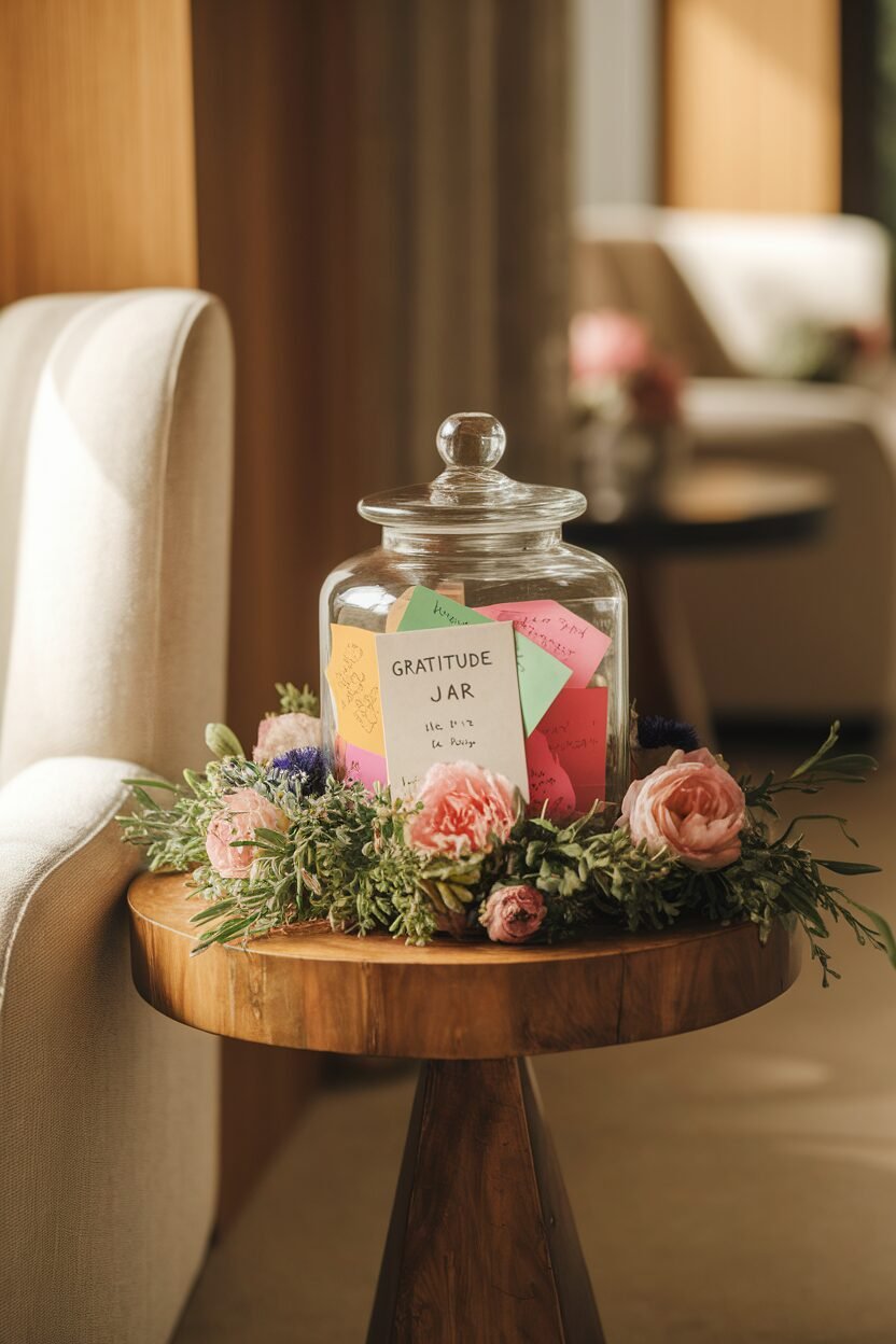 A gratitude jar can be a lovely addition to your lounge. Imagine a beautiful jar filled with notes of things you’re thankful for!