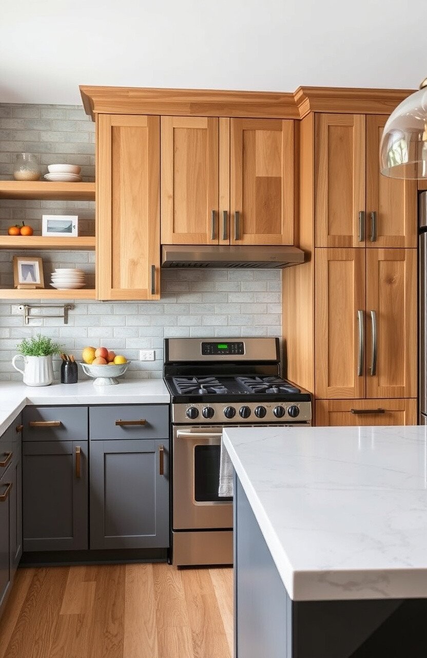 Choose natural wood shelves for a warm touch or metal for a modern feel. This combination is perfect for those who love to showcase their kitchenware.