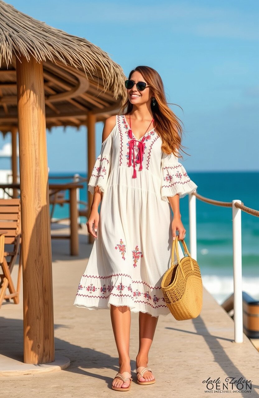 Imagine the sun kissing your skin while you stand barefoot on the sand, wearing a flowy white maxi dress. This outfit screams effortless beauty and freedom. The lightweight fabric sways with the wind, making it perfect for a beach day.
