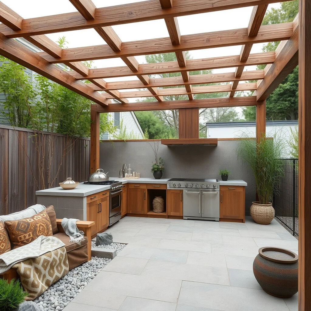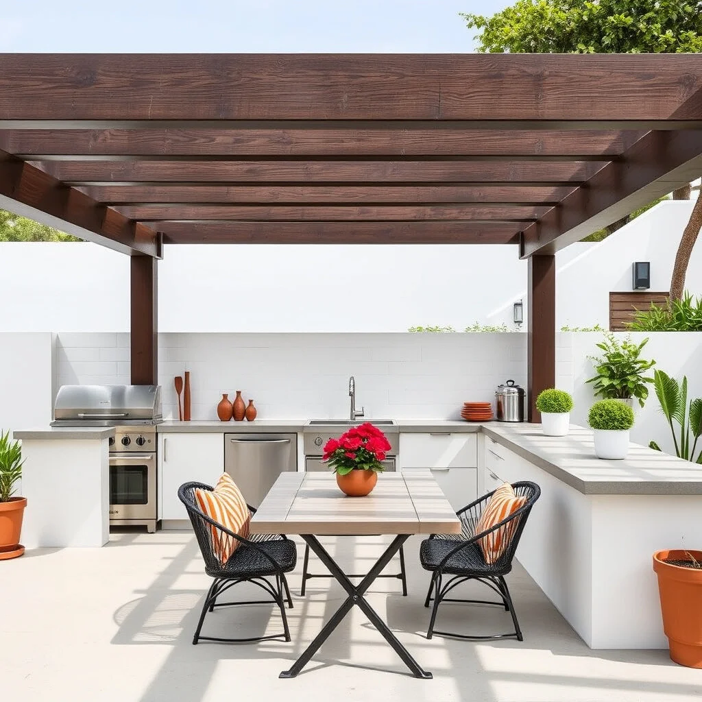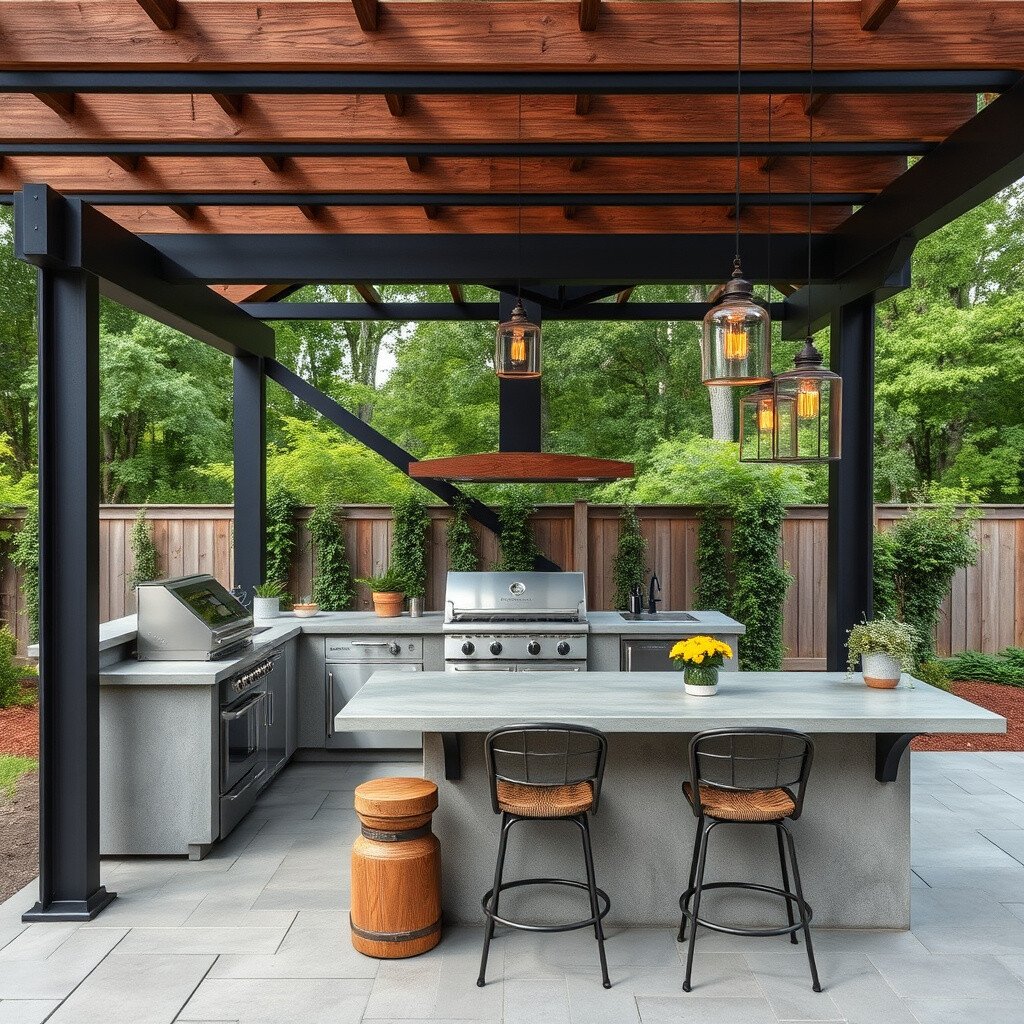 Use metal beams for the pergola and concrete for the countertops. This style is not only trendy but also low-maintenance.