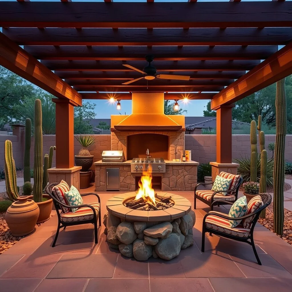 A pergola with terracotta tiles and a fire pit adds to the desert ambiance. It’s a cozy setup for cool nights.
