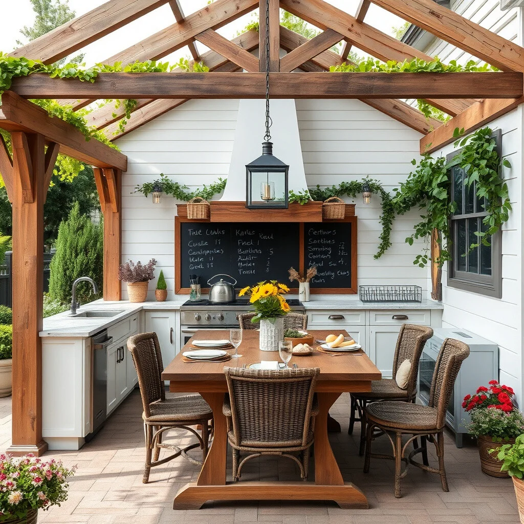 Introduce a large farmhouse table for gatherings. With a pergola covered in vines, it becomes a perfect spot for family meals.