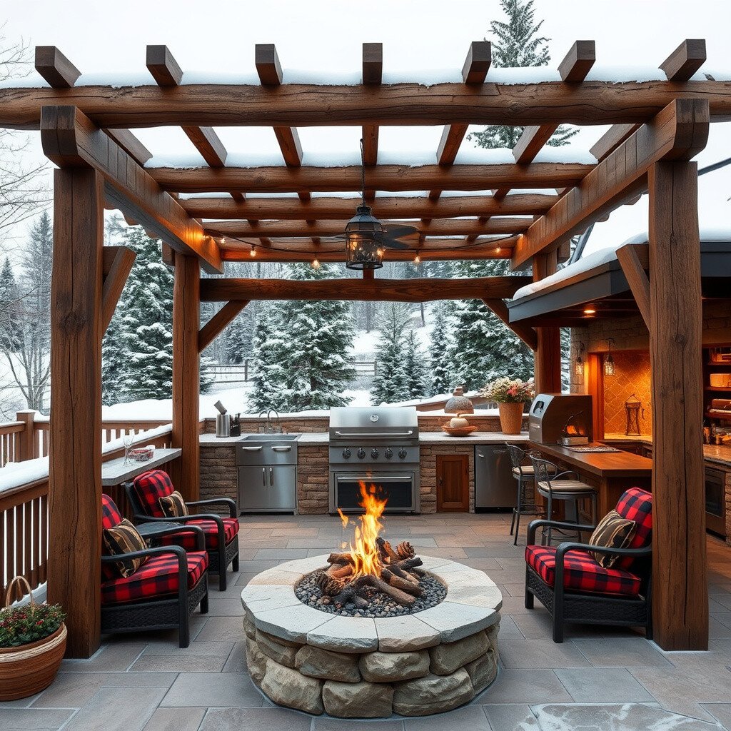 A pergola with thick beams and a fire pit creates a cozy retreat. It’s a perfect space for chilly evenings.