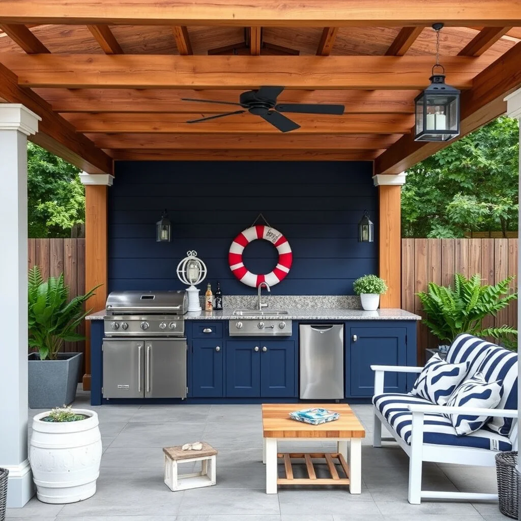 Use nautical elements like rope and lanterns for decoration. A white pergola with billowing curtains completes the serene look.