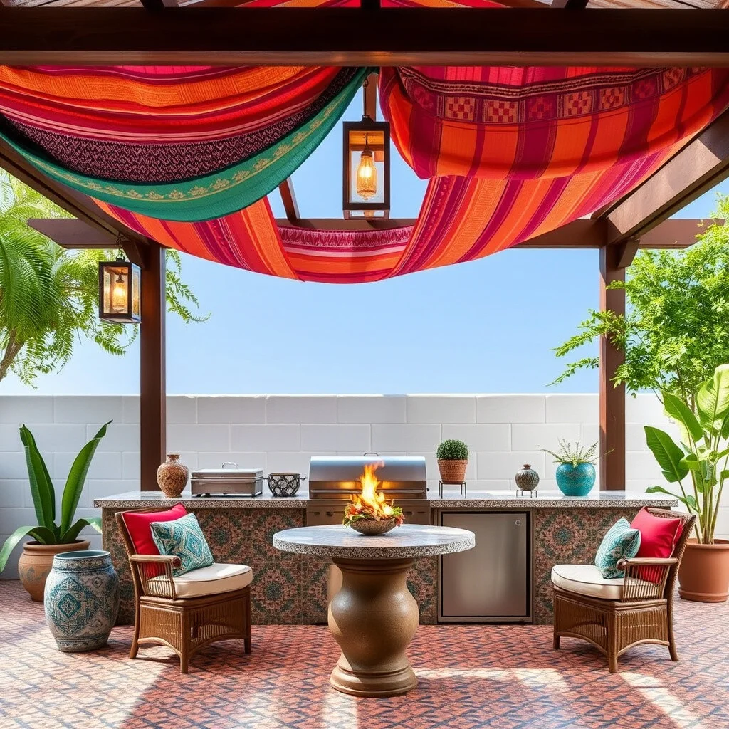 A pergola draped with colorful fabrics enhances the exotic feel. It’s a space that invites relaxation and indulgence.