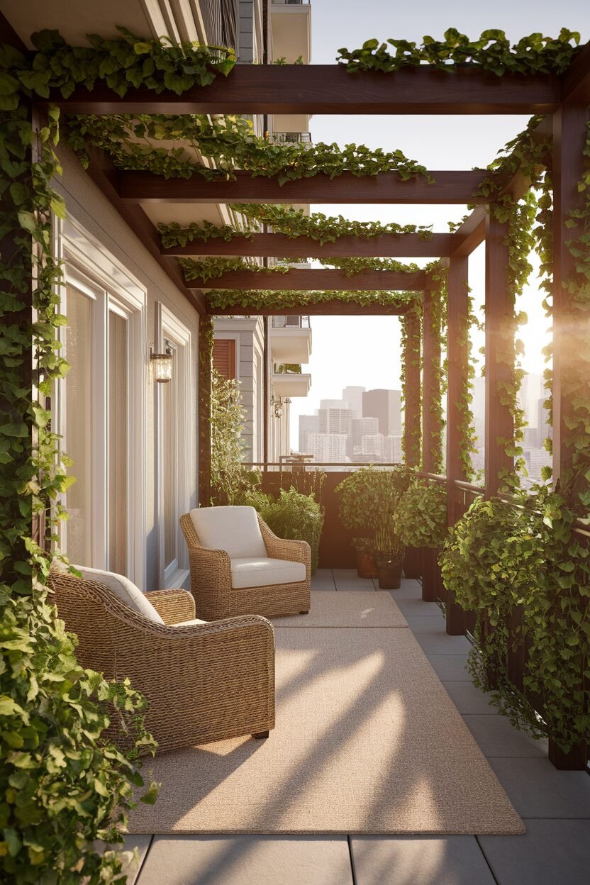 A small canopy or pergola can create a charming focal point on your balcony! It can provide shade and make the space feel more like a cozy retreat.