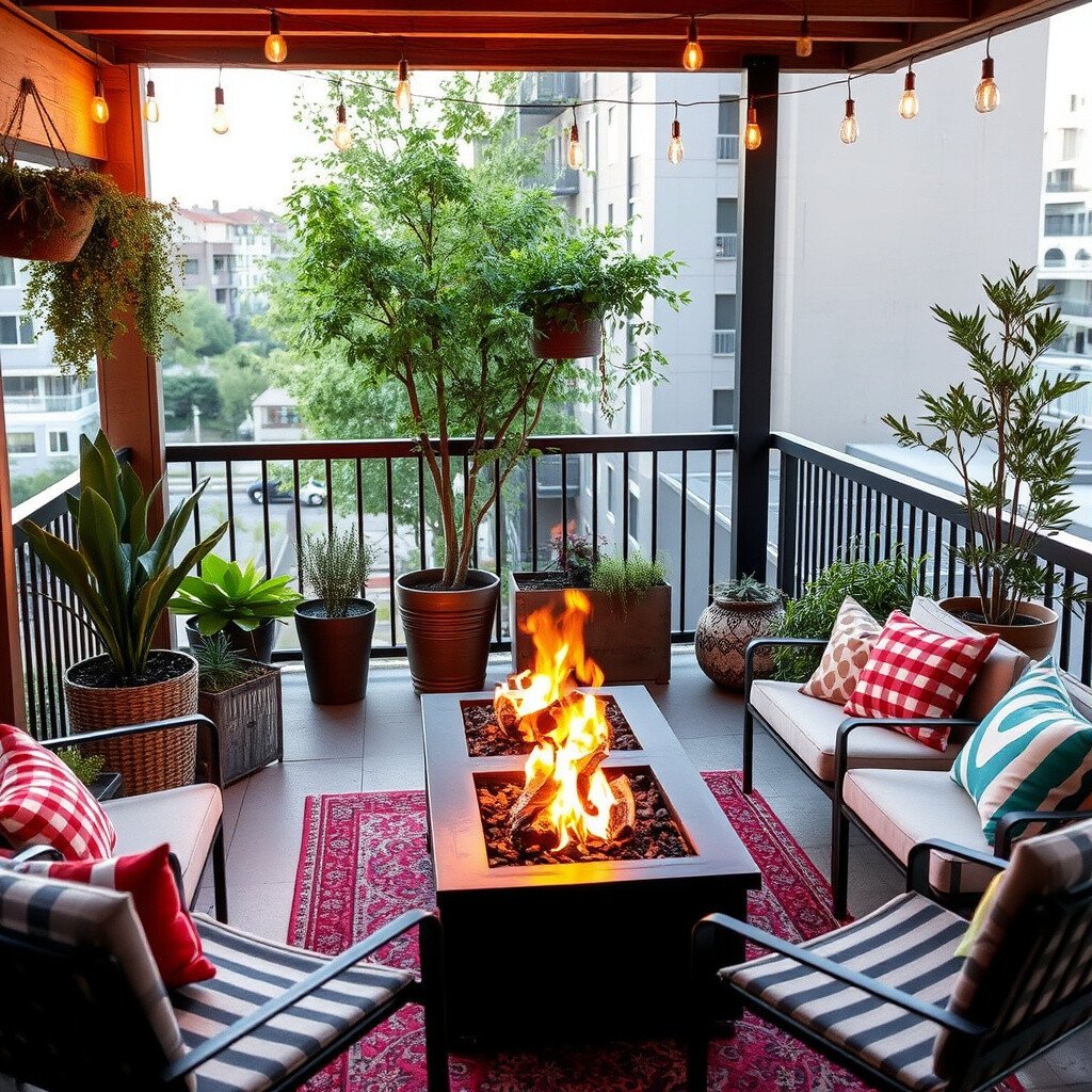 For a warm and inviting atmosphere, consider a portable fire pit. It brings the coziness of a campfire to your balcony.