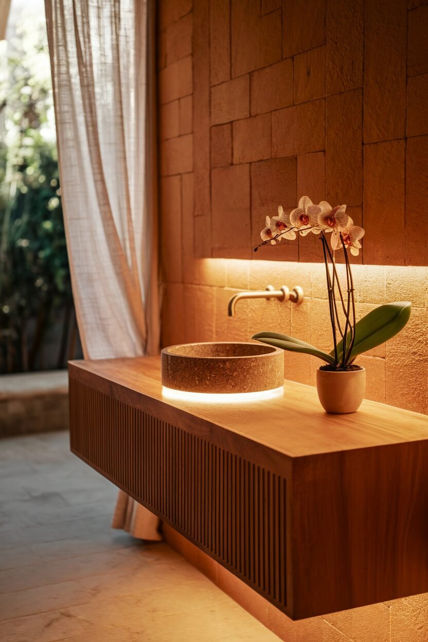 Choose materials and colors that match your overall style, whether sleek and modern or warm and rustic. Adding a vessel sink can enhance the look even more.