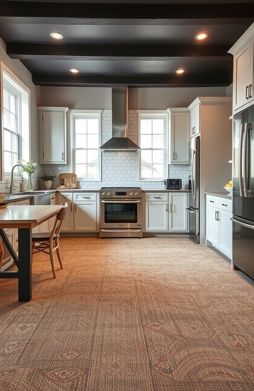 Look for carpets with blended colors and fluid patterns. They can create a calming atmosphere in your kitchen.
