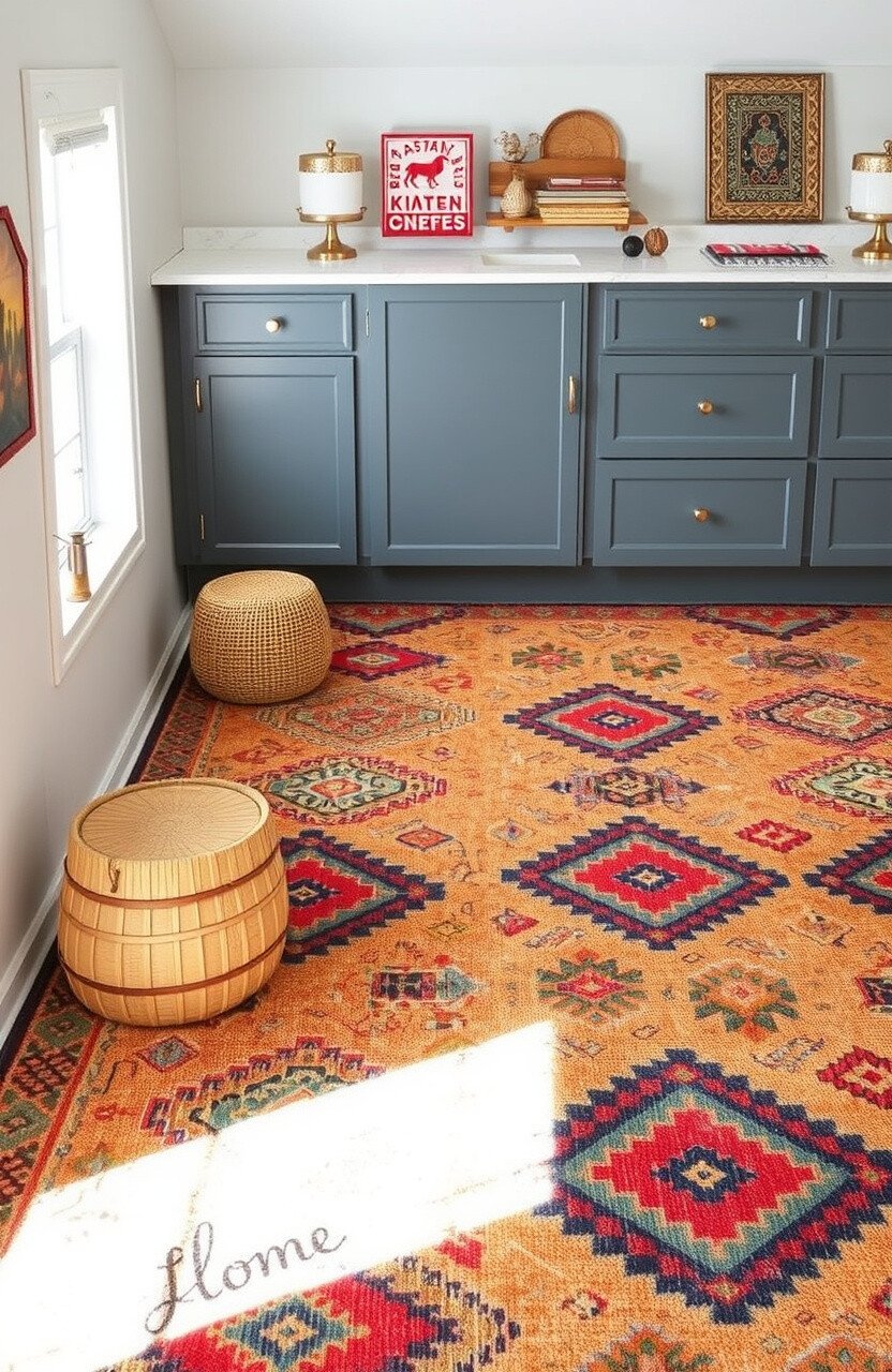 Tribal carpets can add an exotic touch. It’s like a journey to distant lands in your kitchen.