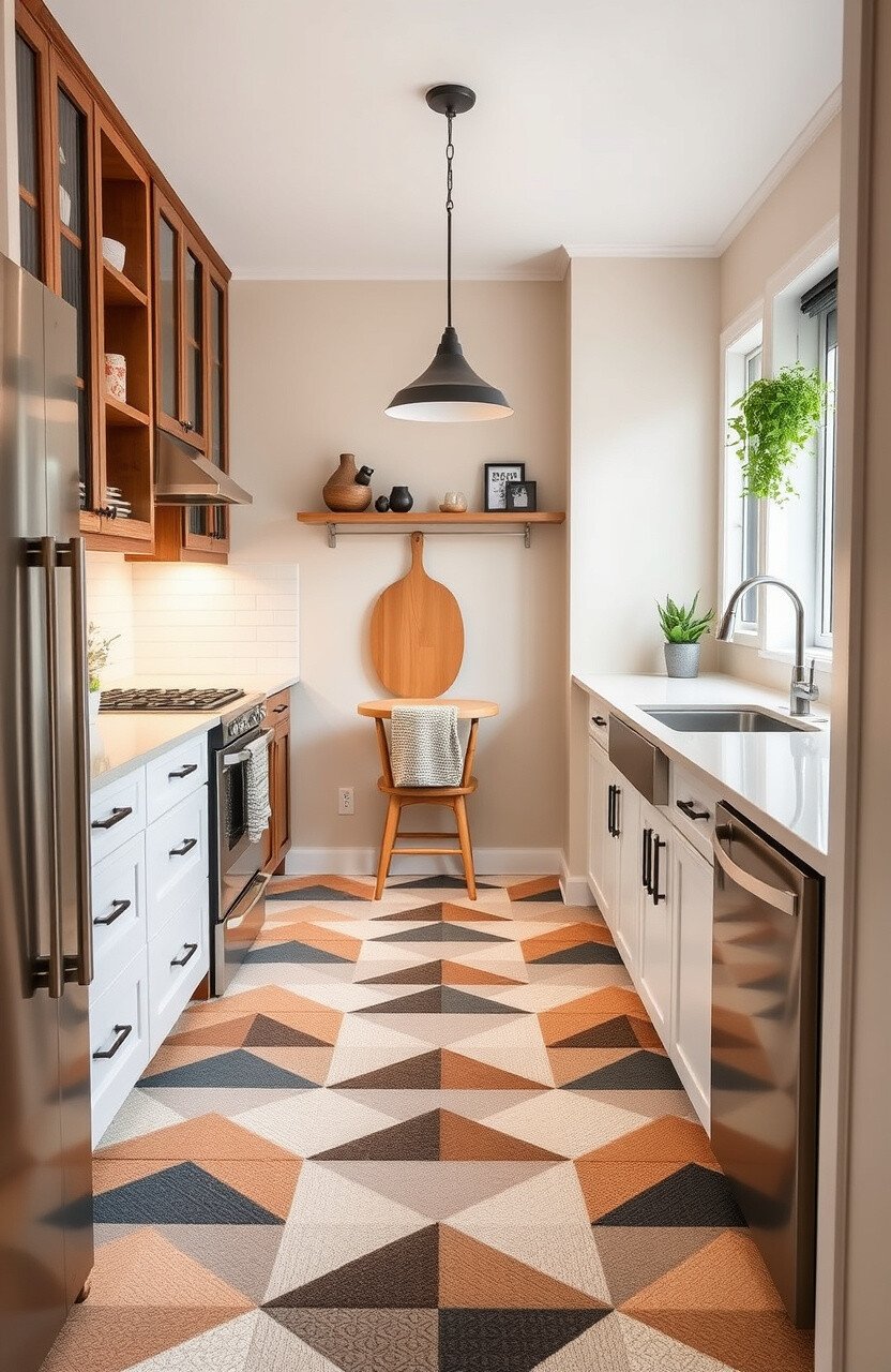 Geometric patterns can add a modern touch to your kitchen. They look like an art piece right on your floor.