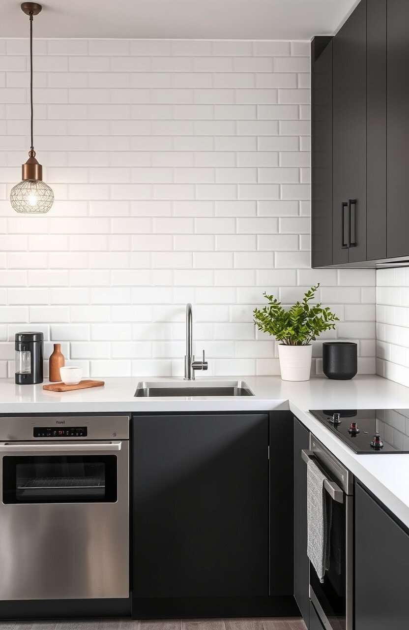 For a stylish edge, consider industrial decor. White subway tiles add a clean and sleek touch.