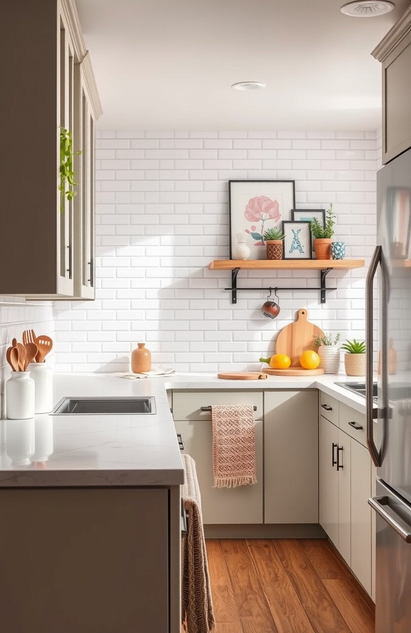 Create a calming kitchen with peaceful decor. White subway tiles add a clean and soothing touch.
