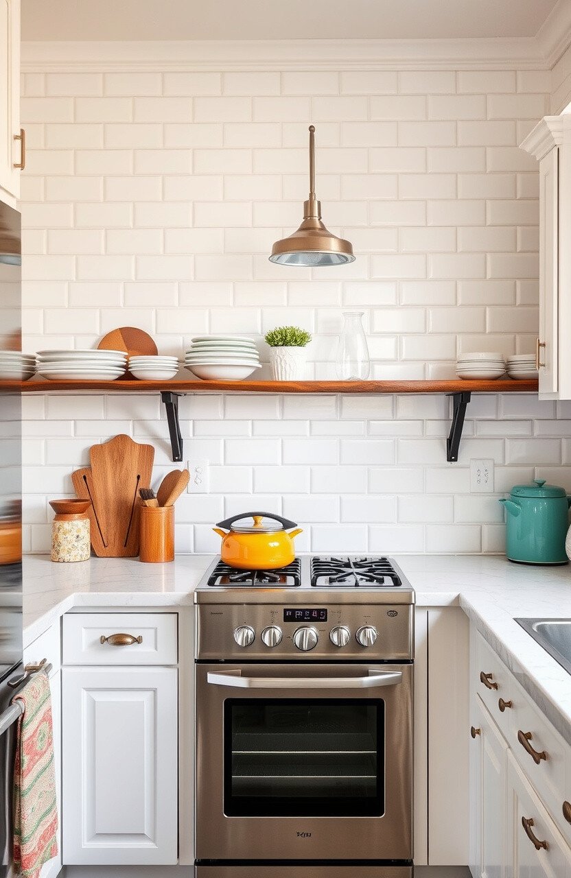 For a lively kitchen, consider vibrant decor. White subway tiles add a clean and bright backdrop.