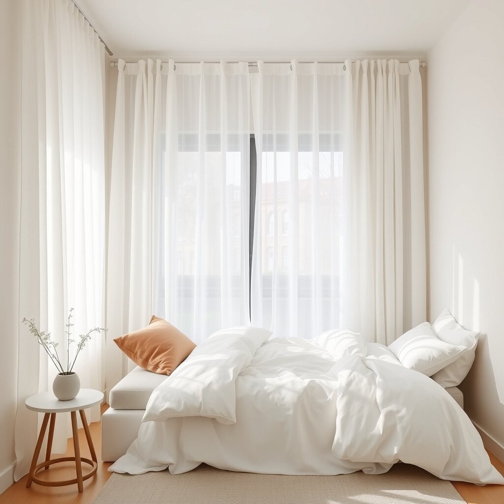 Choose curtains that let light in while offering privacy. Think sheer fabrics or light colors. They make the room feel bigger and more inviting.