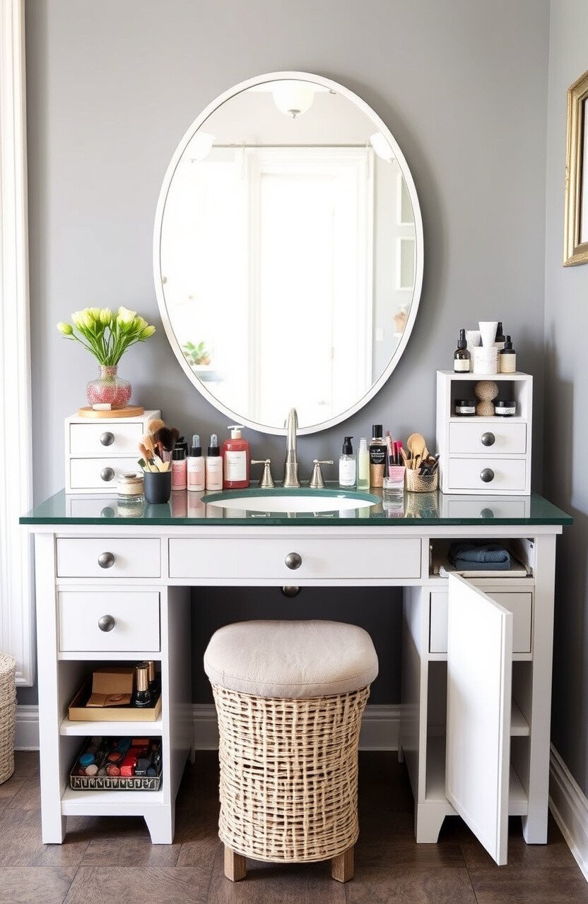 Vanity storage keeps beauty products organized. Perfect for bathrooms or bedrooms.
