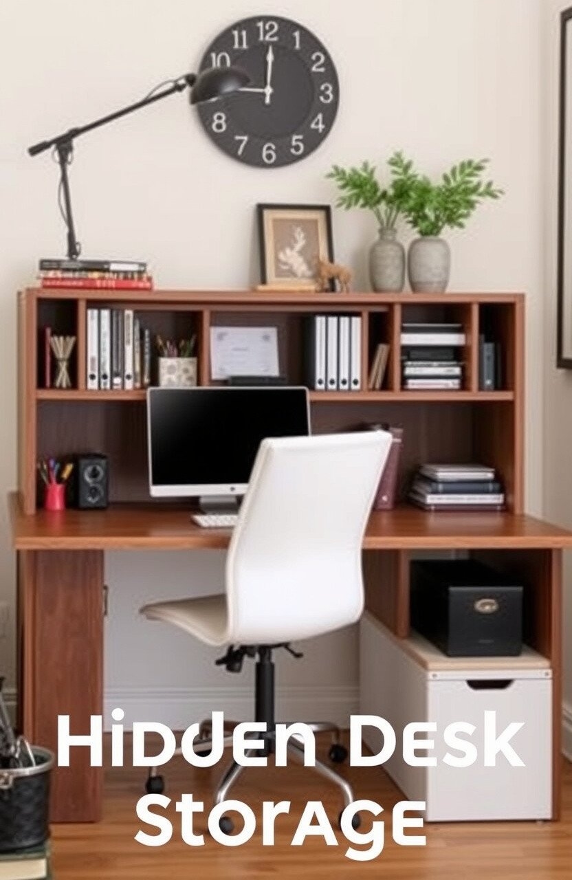 Hidden desk storage keeps your workspace tidy. Perfect for office supplies and paperwork.