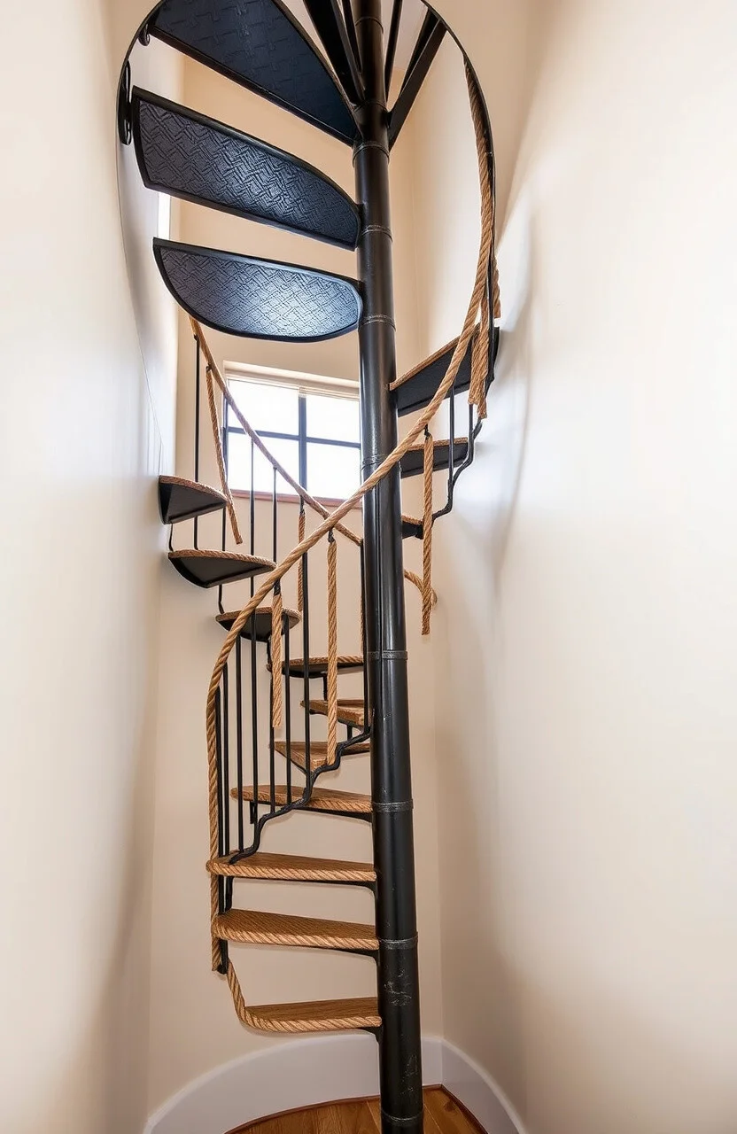 Bring a touch of the sea into your home with a spiral staircase that features nautical rope accents. Perfect for homes with a marine theme.