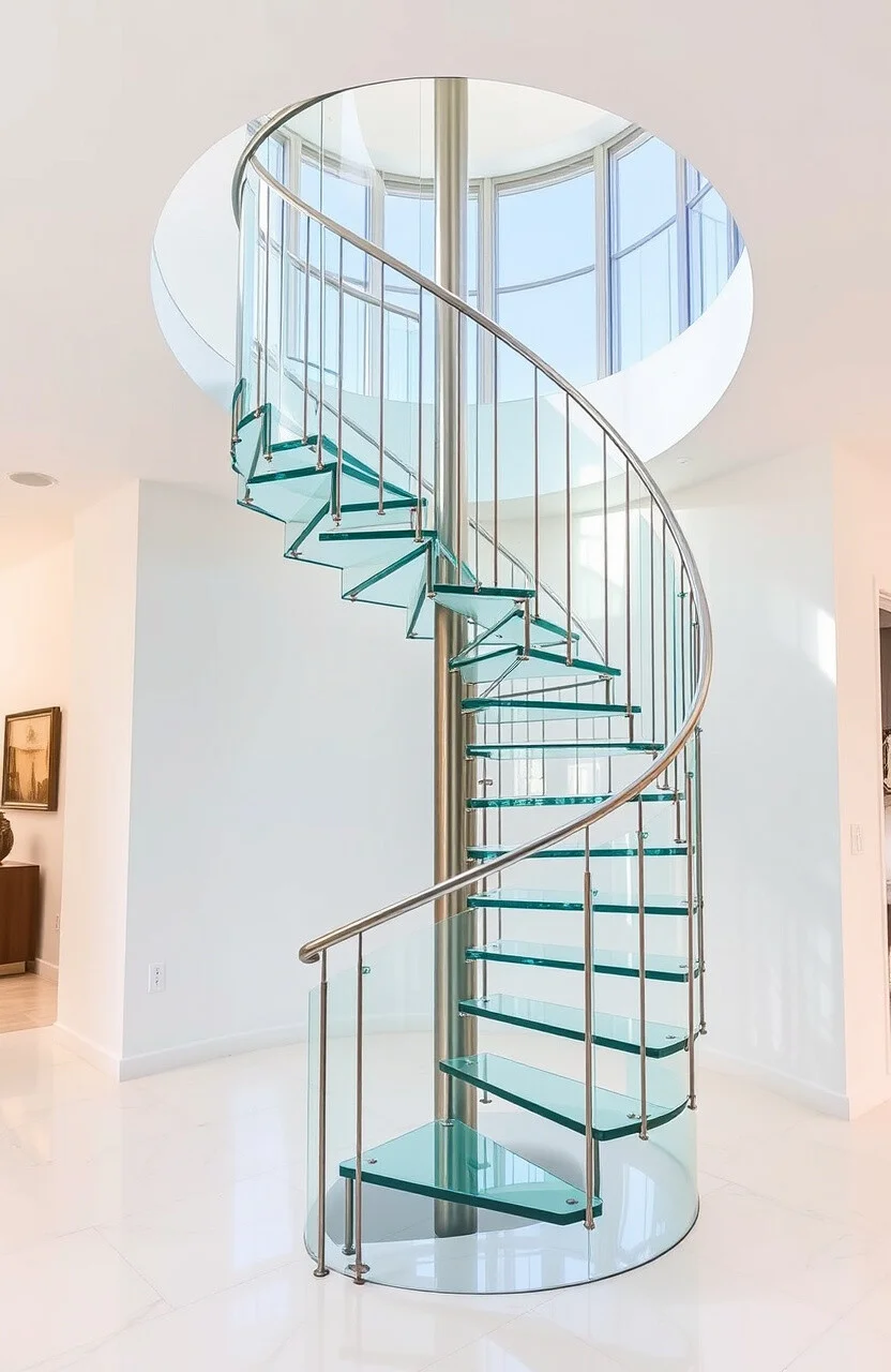 Enhance the light in your home with a spiral staircase that incorporates glass elements. It’s perfect for creating a bright, open atmosphere.