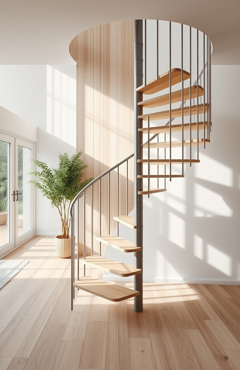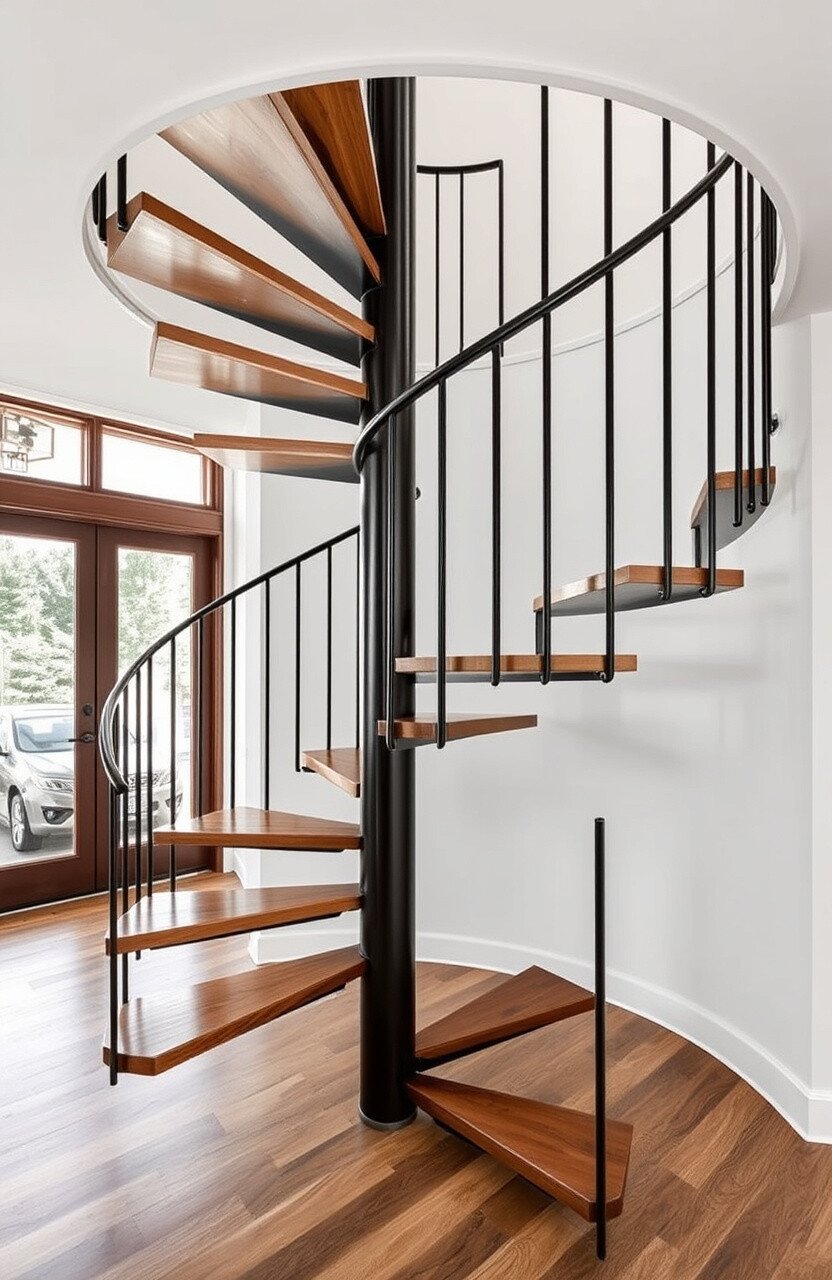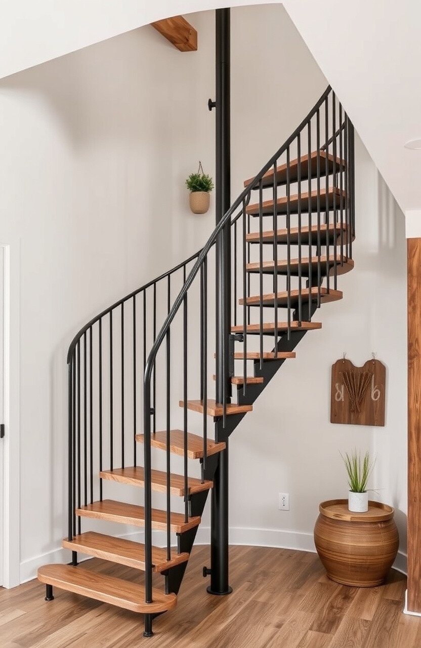 A spiral staircase with wood accents offers a rustic charm. It combines the durability of metal with the warmth of wood.