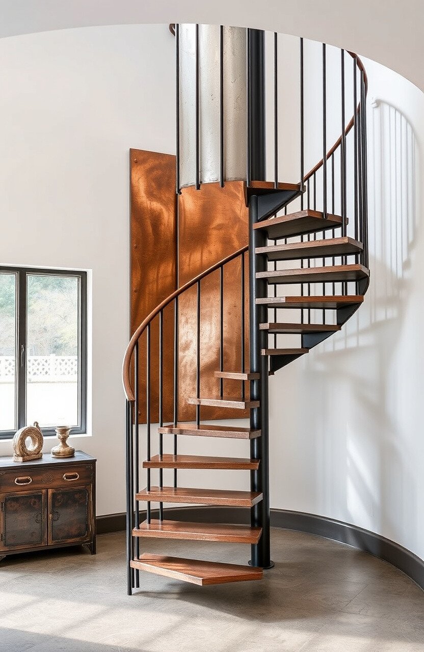 Imagine combining the raw beauty of wood with the sleekness of metal. The wooden steps provide a warm contrast to the cold metal spiral.