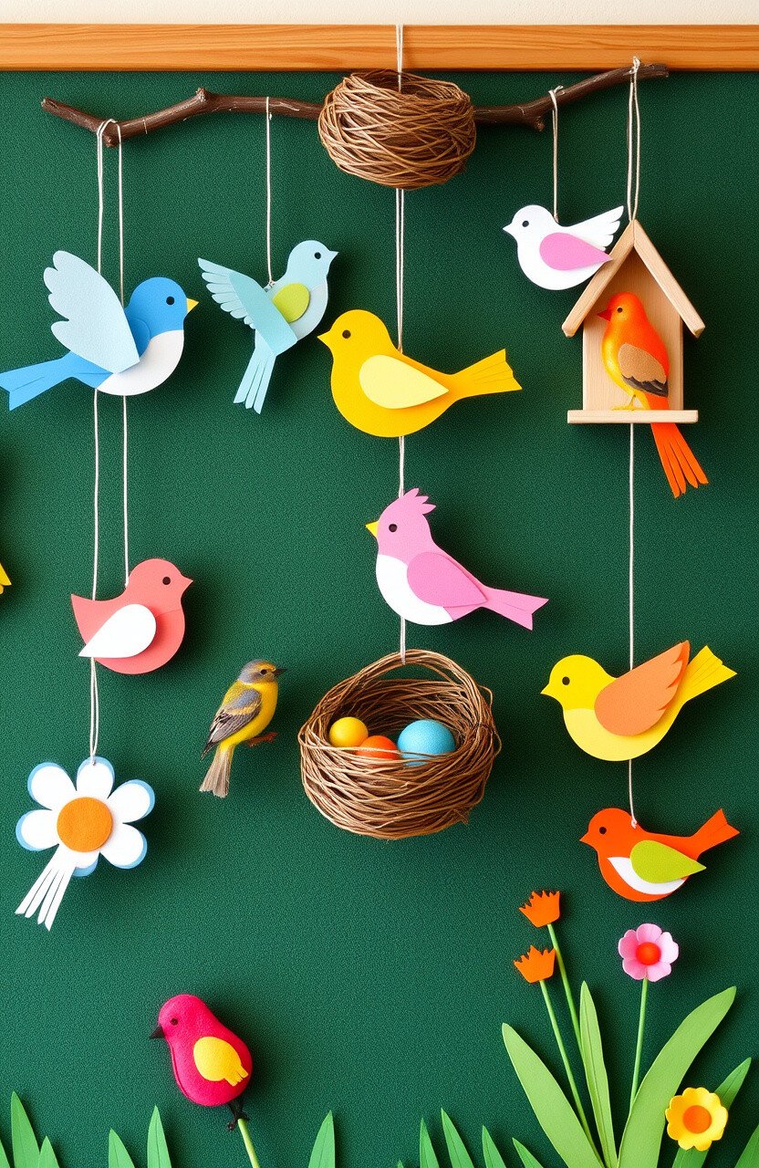 Craft cute birds out of paper or felt. Hang them from the board with string.