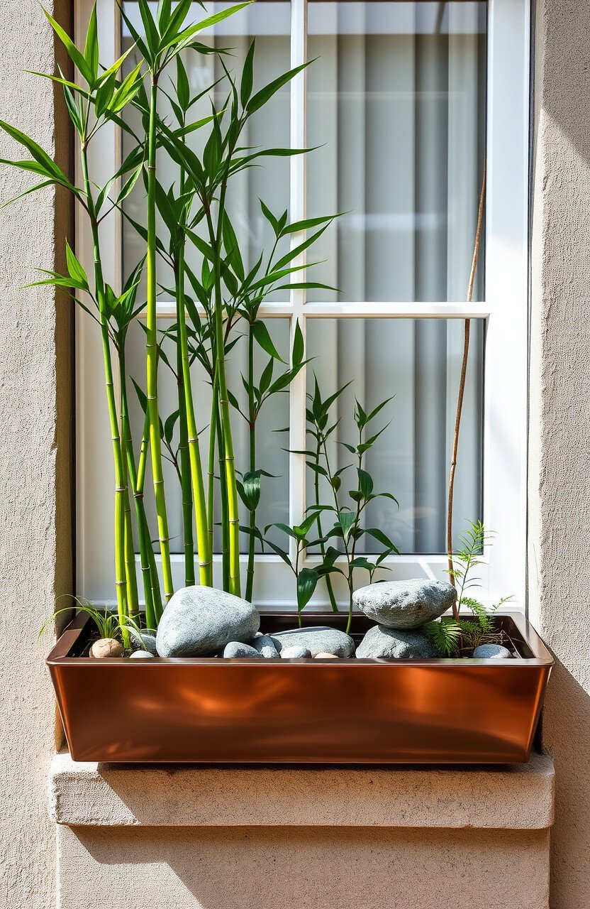 Transform your window space into a peaceful retreat with a zen-themed window box. Use bamboo plants, smooth stones, and a small water feature for tranquility.