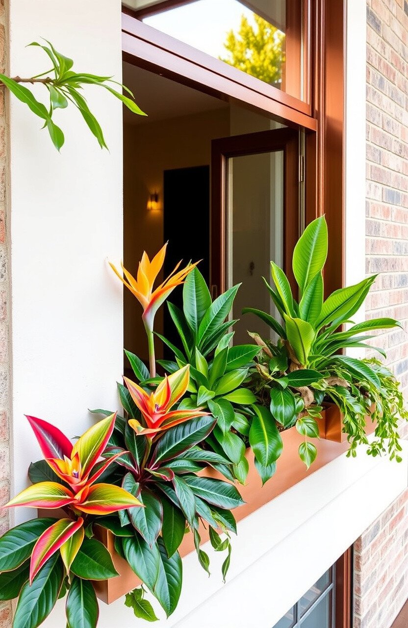 Bring the tropics to your window with vibrant plants like bromeliads or bird of paradise. Their bold colors pop against the warm glow of copper.