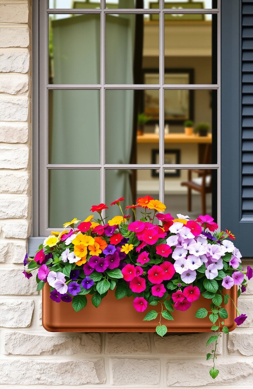 Colorful blooms like petunias and pansies can turn any window box into a miniature garden. The bright petals against the copper backdrop create a striking contrast that’s hard to miss.