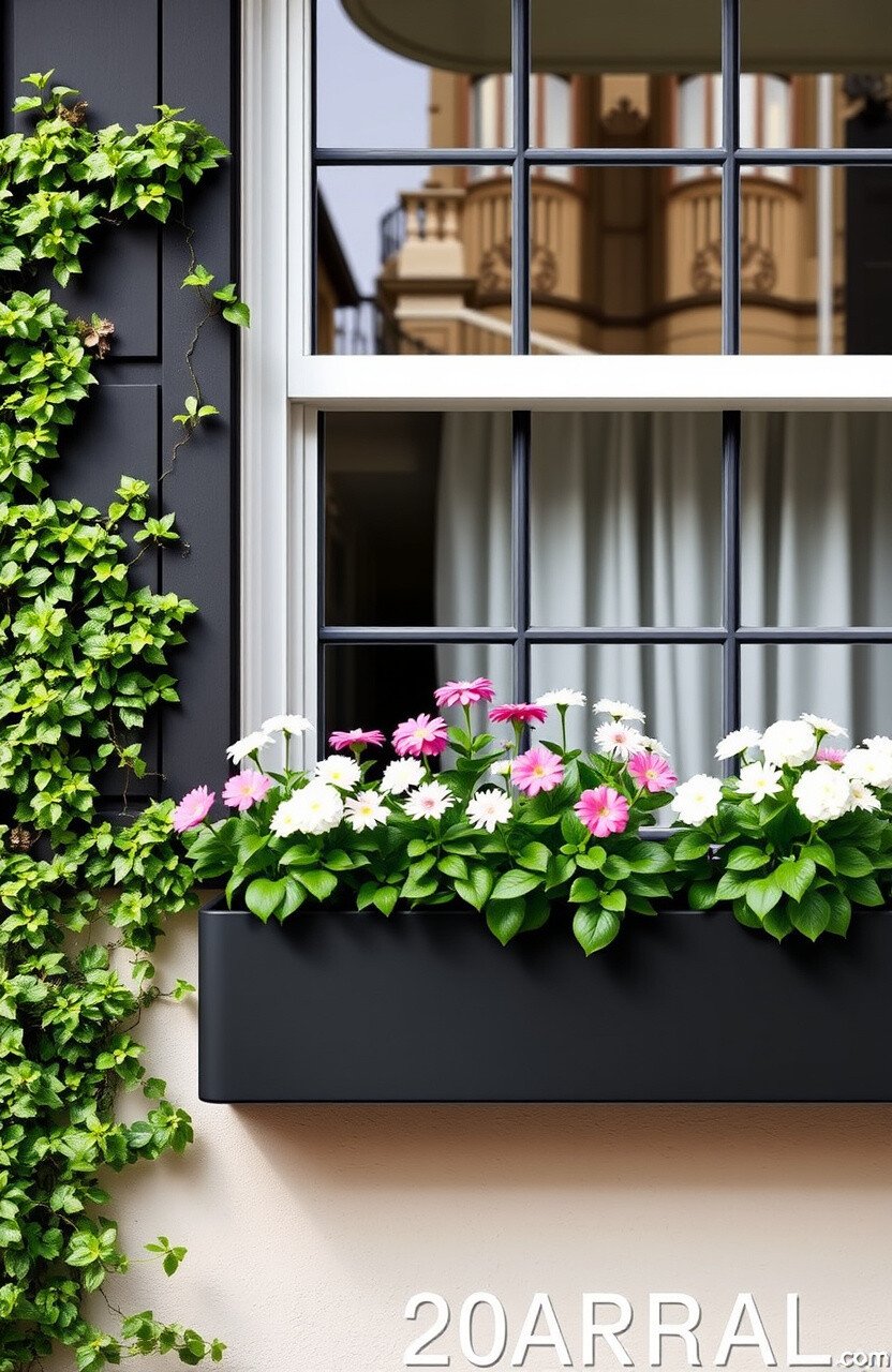 Matte black window boxes offer a chic, modern touch. Black is a versatile color that pairs beautifully with any flower or plant, allowing your greenery to truly stand out.