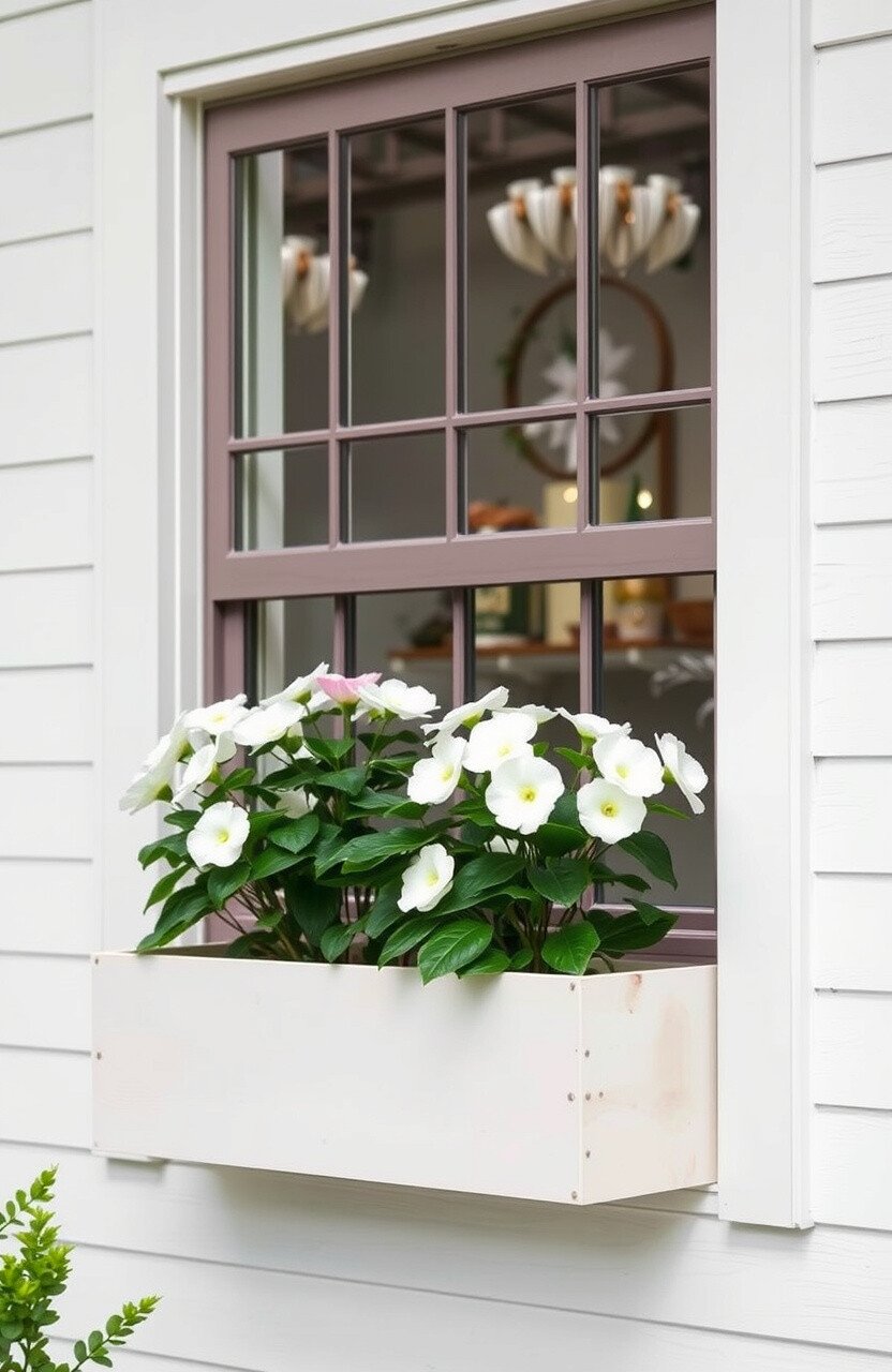 A whitewashed wooden box brings a touch of elegance and simplicity to your window sills. The light color reflects the sunlight beautifully, making your flowers pop. It’s a lovely choice for a cottage-style home.