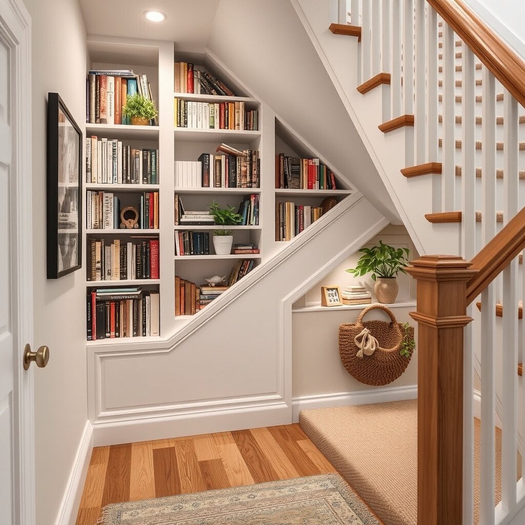 Turn the space under your stairs into a mini-library. Built-in shelves can hold books, plants, or decorative items.