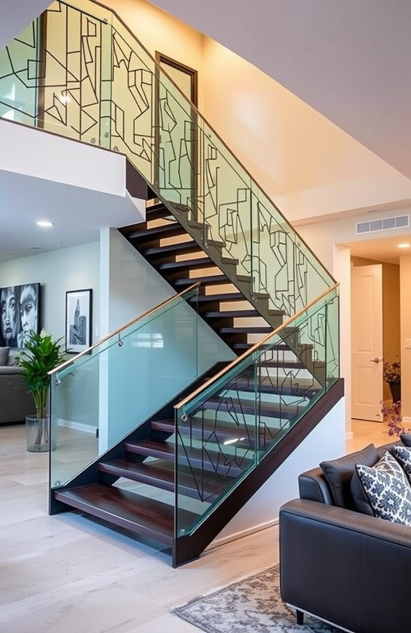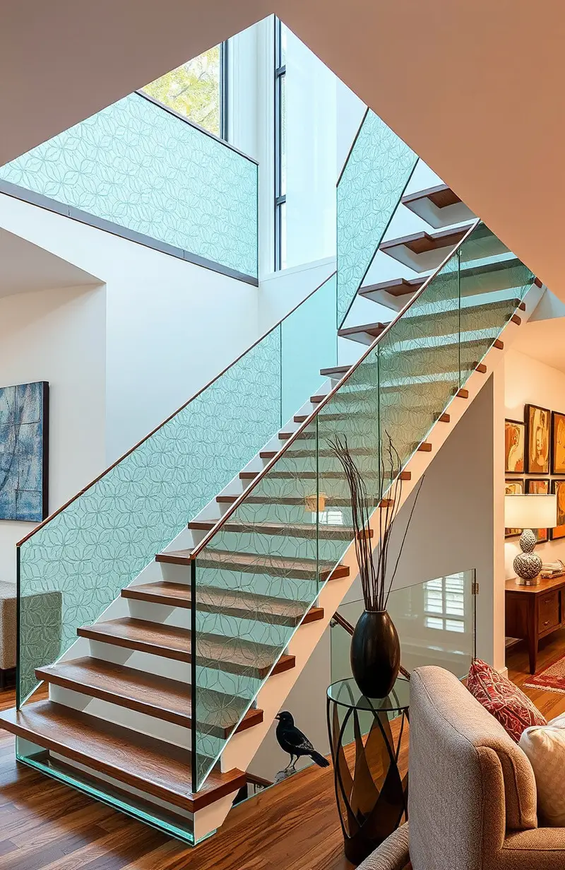 Patterned glass railings add a decorative touch to your staircase. They make it feel like a work of art.
