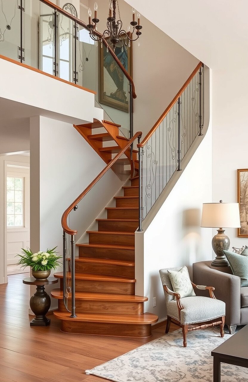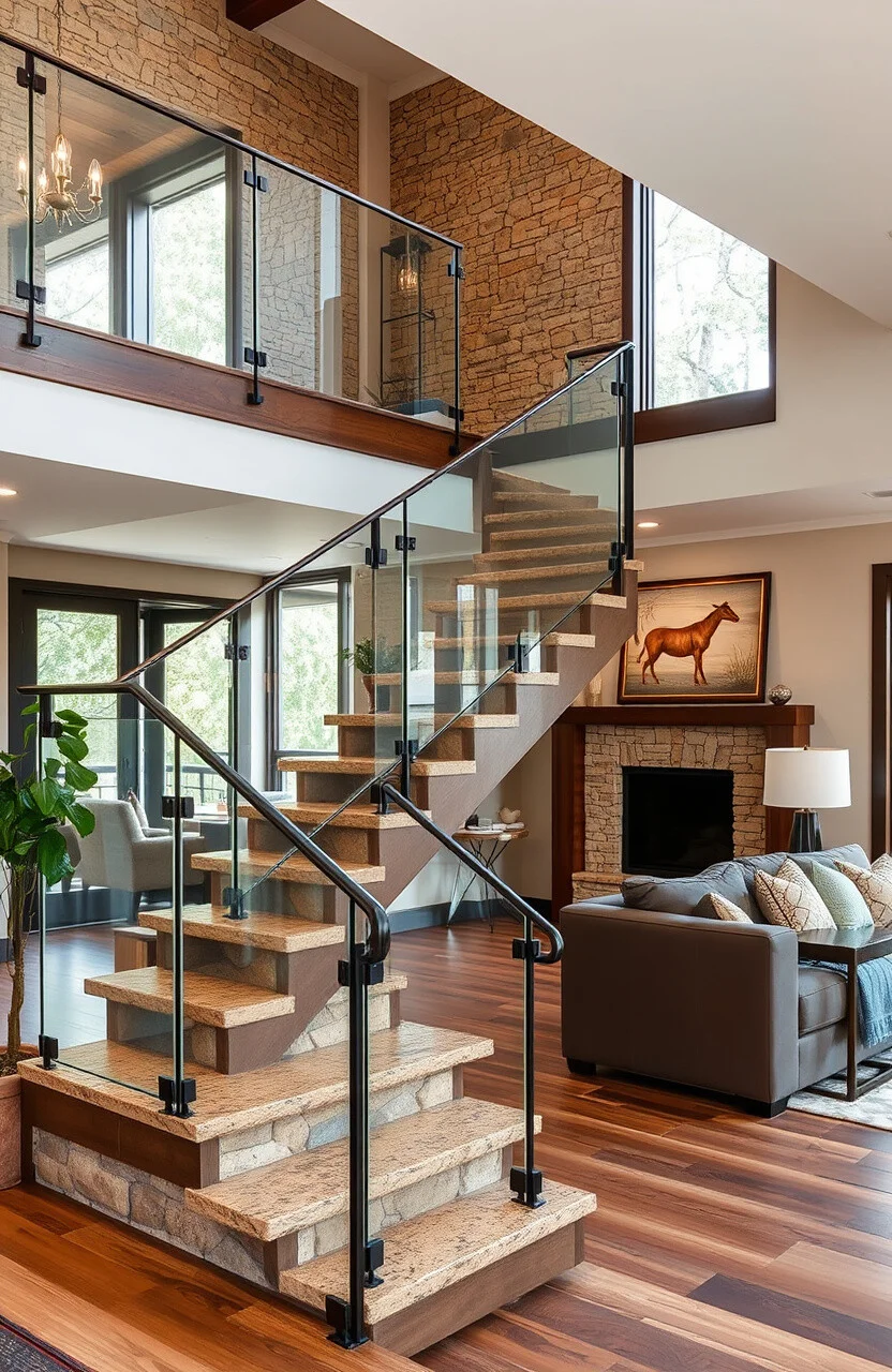 Mixing materials like glass and wood can create a warm, inviting atmosphere. Wooden handrails with glass railings are perfect for this.