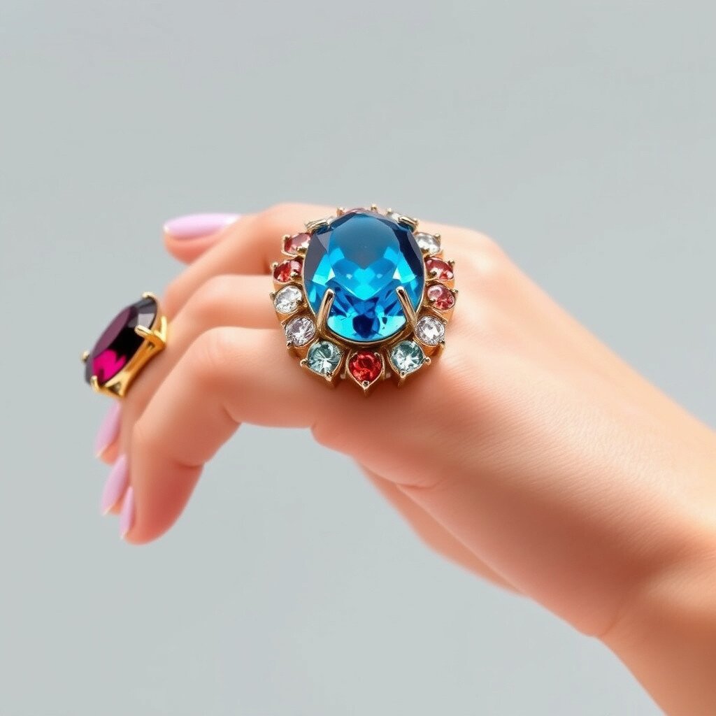 These rings often feature large, colorful gemstones or unique shapes. They’re perfect for adding a pop of color to your ensemble. Wear them on their own or stack them with simpler rings for a layered look.