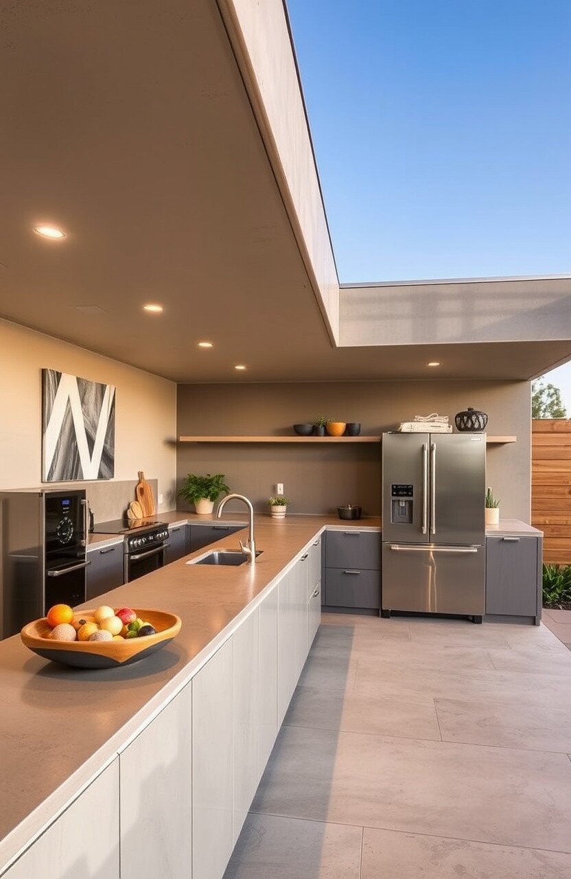 For those who love mixing styles, an eclectic outdoor kitchen is perfect. Concrete counters provide a versatile base for creativity.