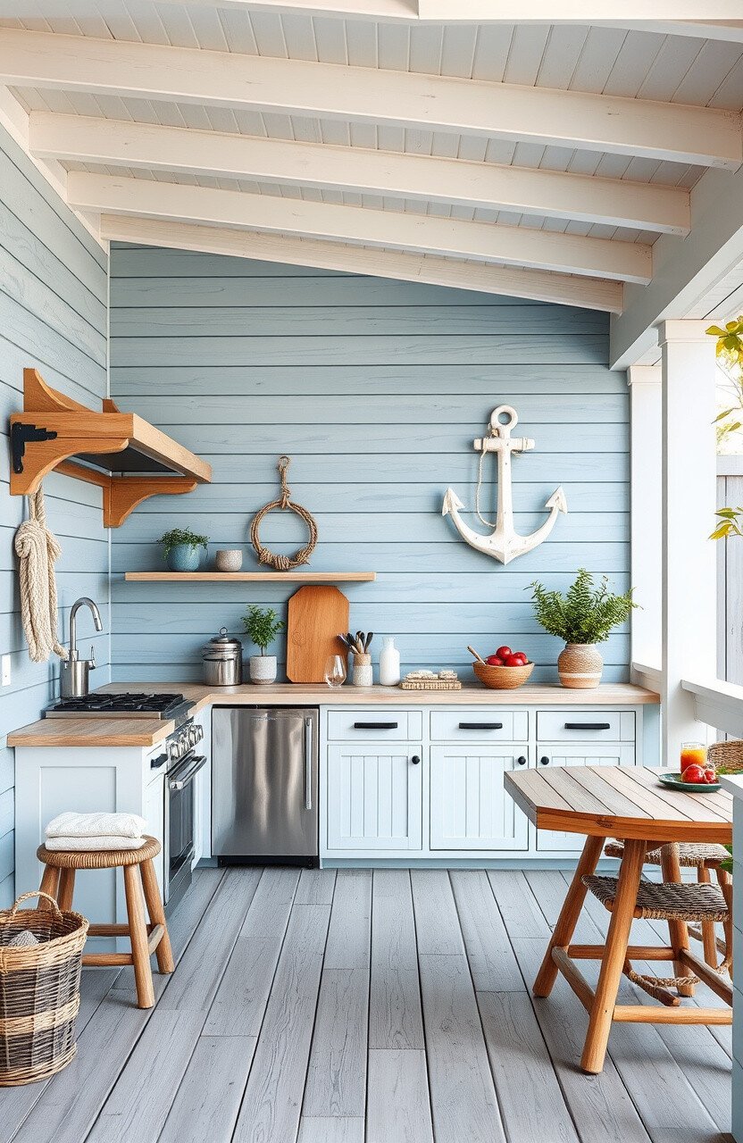 Bring the beach to your backyard with wood cladding in cool blue or white tones. Add nautical decor like ropes and anchors.