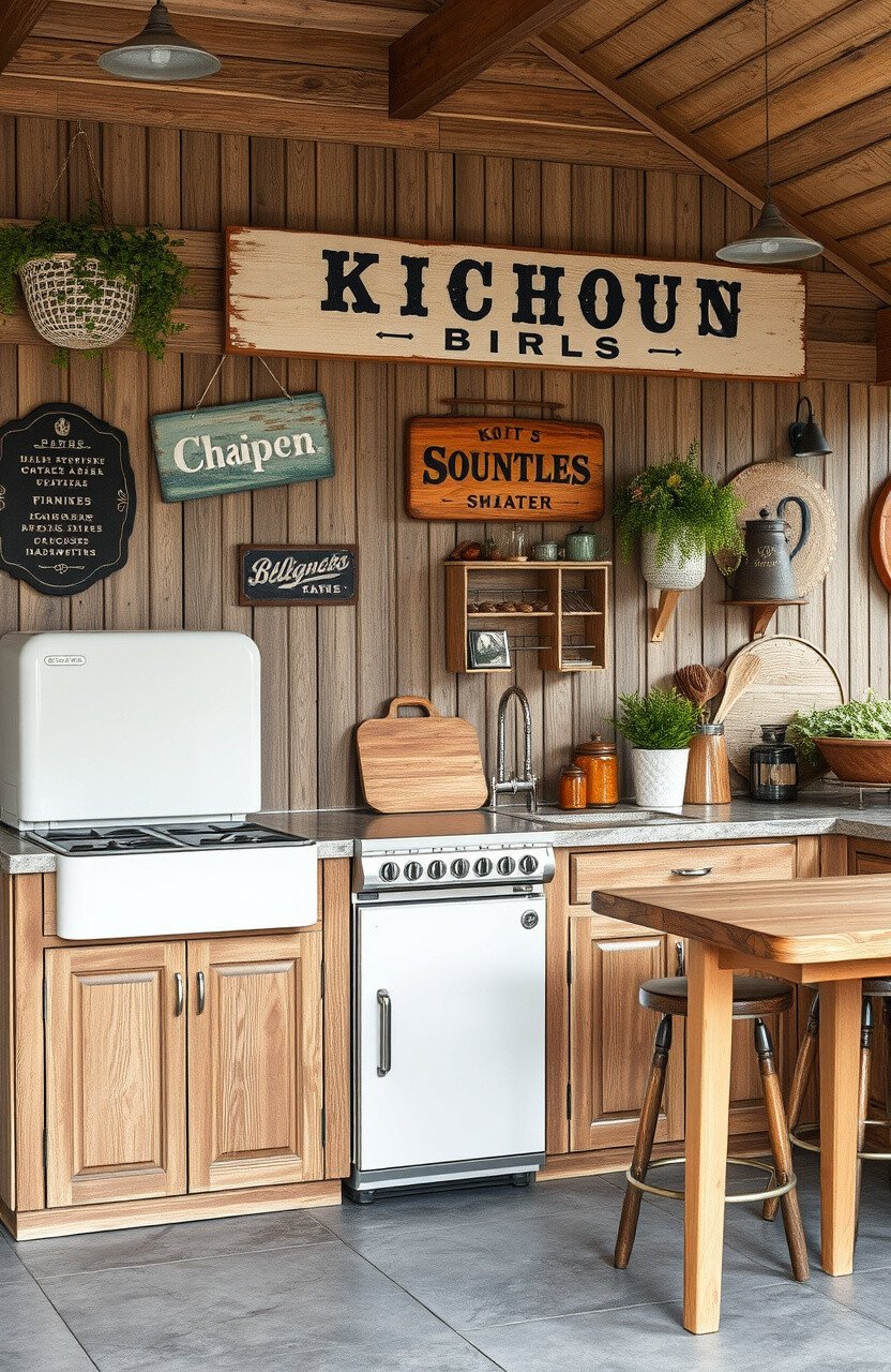 Use distressed wood for a vintage look. Add antique signs and retro appliances.
