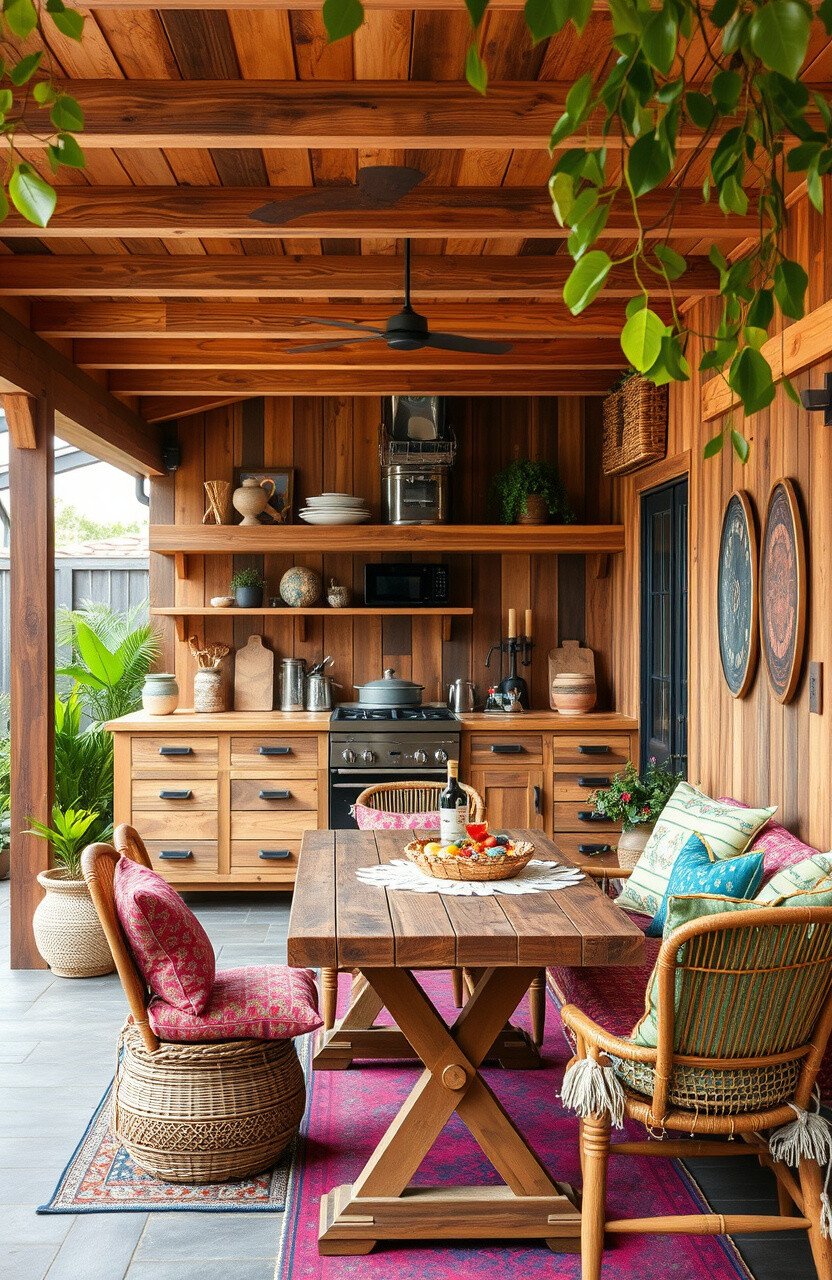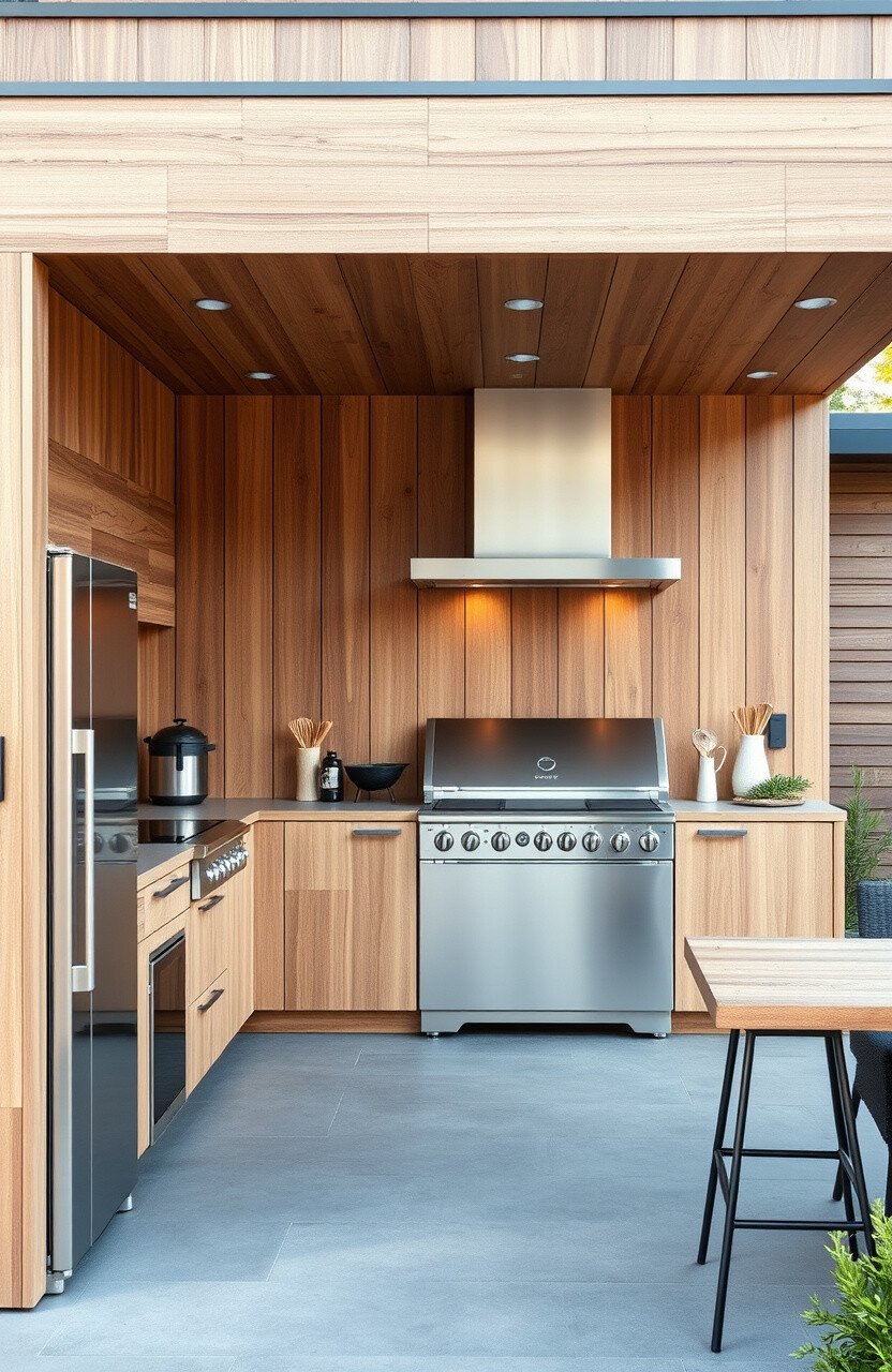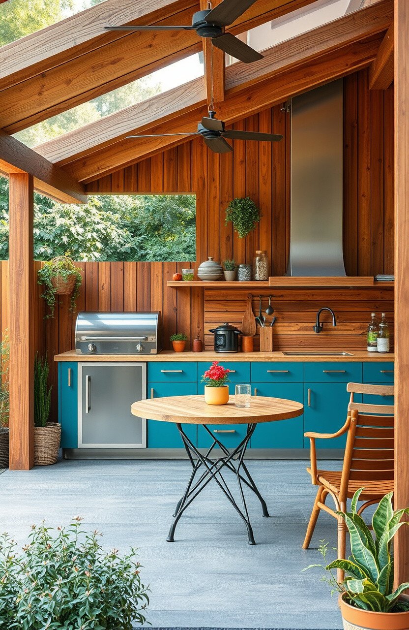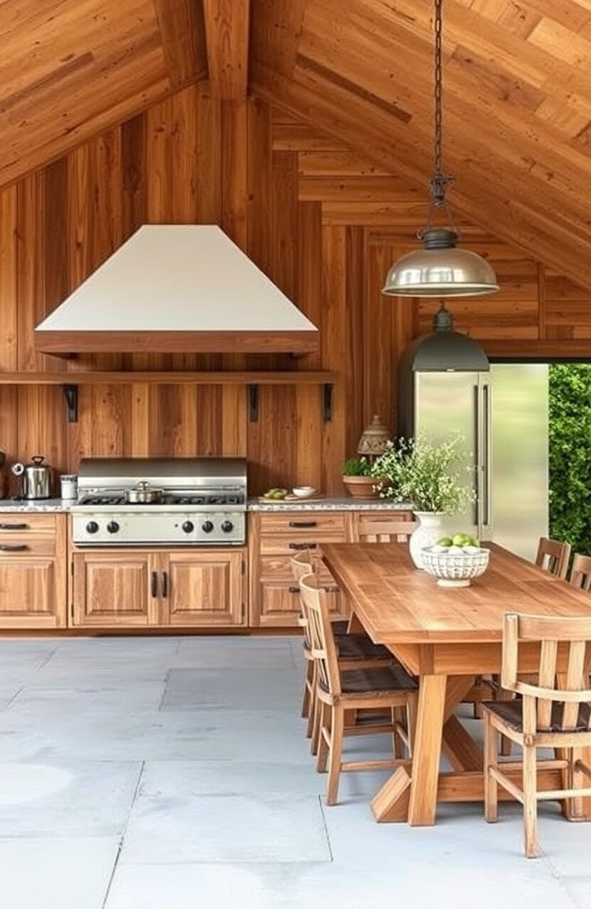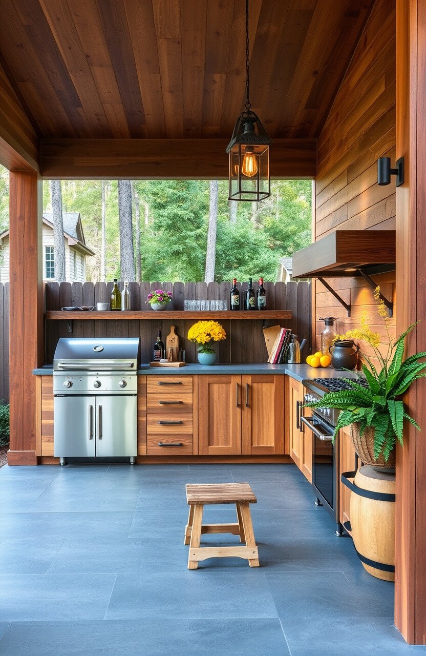 Picture a kitchen that feels like a cozy cabin retreat. Rustic wood cladding can bring that vibe to your backyard. Use reclaimed wood for an eco-friendly touch and add vintage lanterns for lighting.