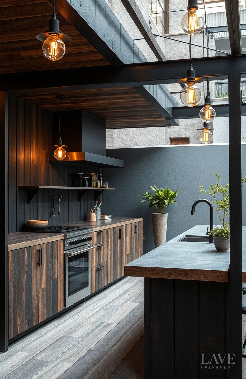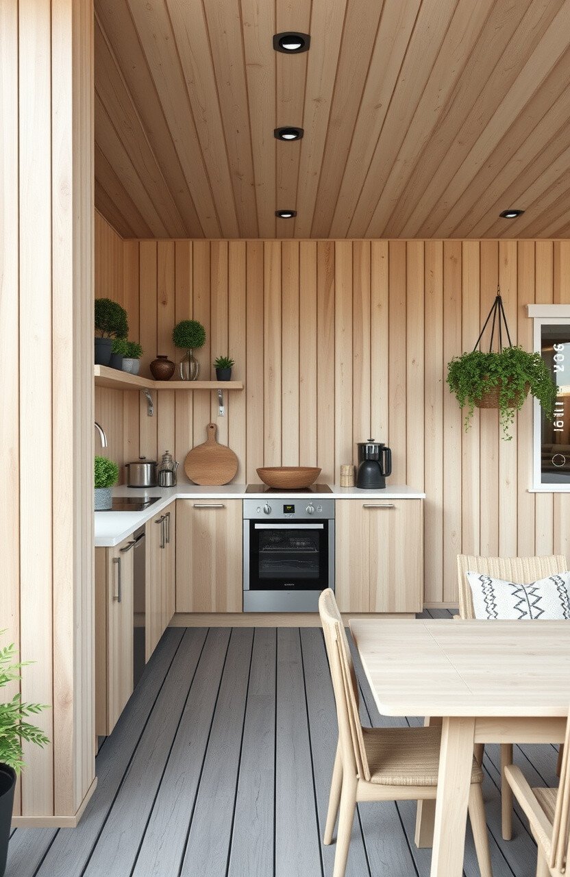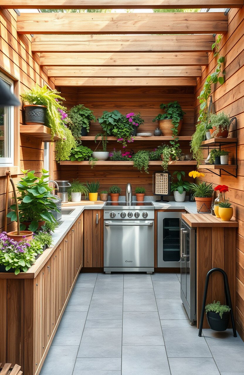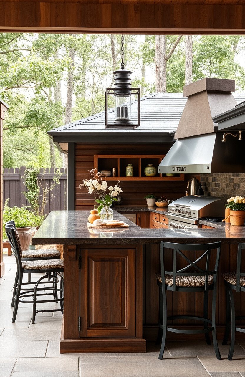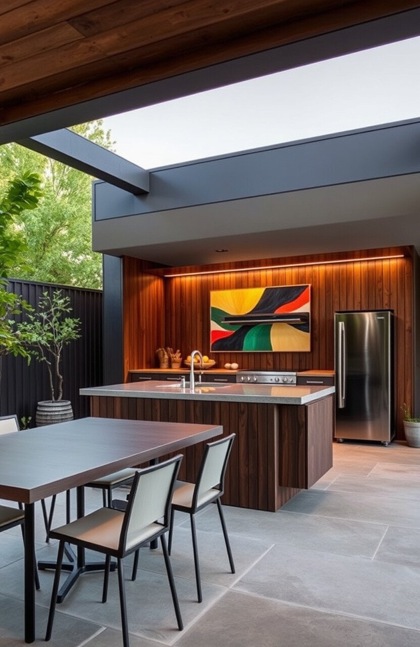 Picture a kitchen that feels like a cozy cabin retreat. Rustic wood cladding can bring that vibe to your backyard. Use reclaimed wood for an eco-friendly touch and add vintage lanterns for lighting.