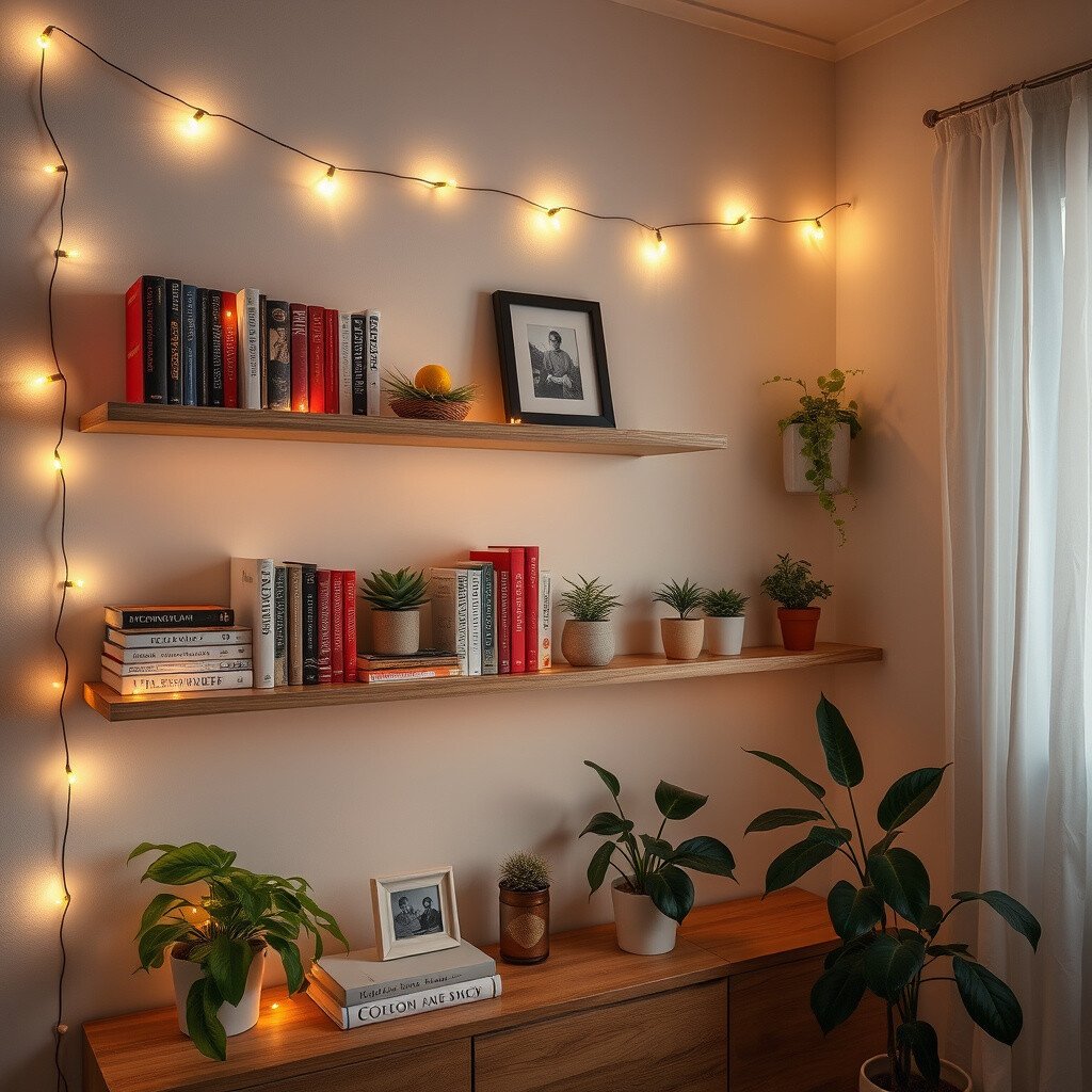 Line your shelves with string lights to showcase your favorite items. The lights draw attention to books, plants, or collectibles, making them stand out.