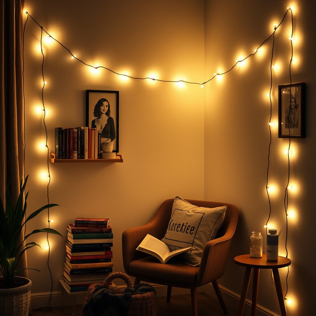 Wrap string lights around a corner of your room to create a cozy reading nook. Add a comfy chair and a pile of books, and you have the perfect spot to unwind.