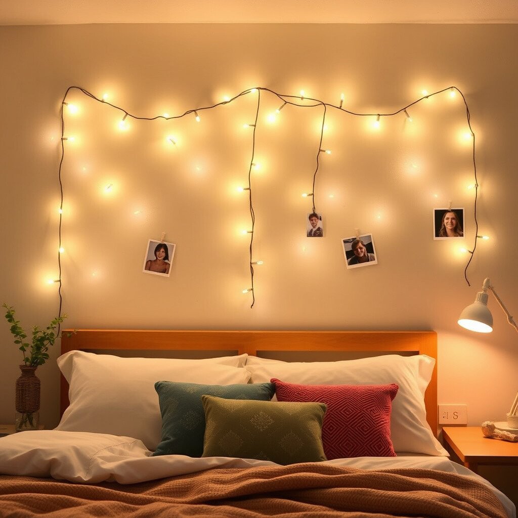 This idea not only adds charm but also serves as a gentle nightlight. Opt for soft white lights for a serene atmosphere or colorful bulbs for a playful touch. Personalize it with photos or small art pieces hanging alongside the lights.