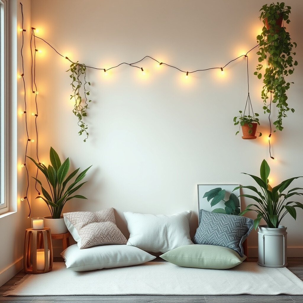 Create a zen corner with string lights, plants, and cushions. This setup is perfect for meditation or simply relaxing with a cup of tea.