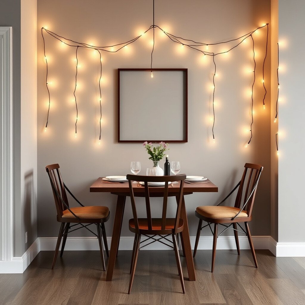Hang string lights above a dining area for an elegant ambiance. This idea makes meals feel special and intimate.